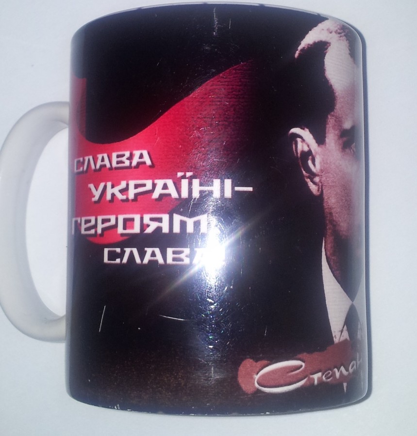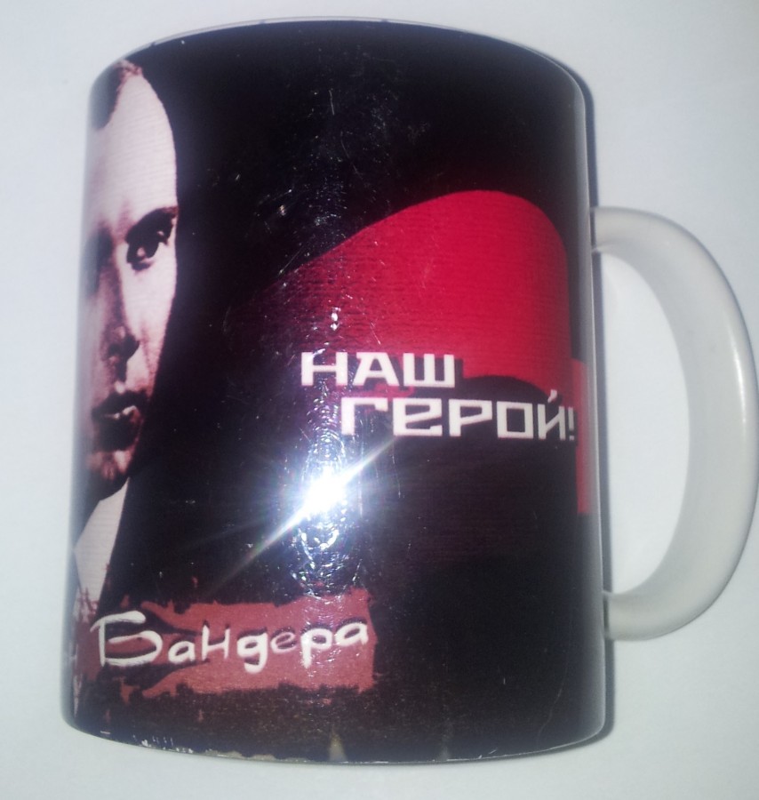 Эту чашку мне (от автора) привез из Львова три года назад друг. Подчеркну - это было 3 года назад. Мы думали, что это стеб над упоротыми националистами. Это было забавно. Прошло три года, мне понадобилось кое-что прибить и я полез в ящик с интрументами. В этой чашке у меня хранятся гвозди. И я посмотрел на сувенирную продукцию совсем другими глазами. Три года назад это казалось смешным. Ну кто в здравом уме назовет террориста своим героем? Кто всерьез будет восхищаться фашистским разведчиком и гитлеровской марионеткой? Это просто шутка, стеб, высмеивание... Прошло три года и оказалось, что это все всерьез. Что "Слава Украини - героям слава!" - этот лозунг родился не вчера. Его день за днем продвигали в головы людей. Кружечками, значками, буклетиками...