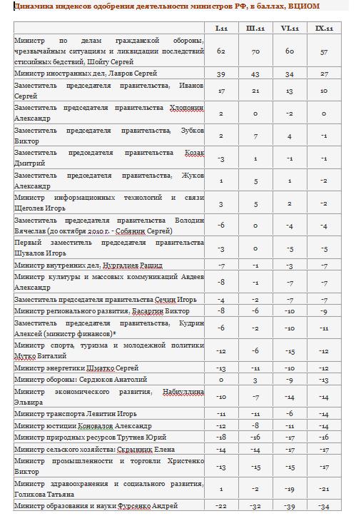 Динамика индексов одобрения деятельности министров РФ, в баллах, ВЦИОМ