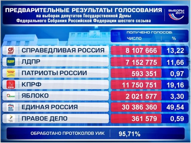 Были ещё на ВЦИОМ результаты голосования(никак не могу их найти): Удовлетворены ли вы работой Гос Думы 5 созыва. Так вот около 84 процентов опрошенных, а это более 30.000 человек ответили НЕТ! Рядом висели результаты экзит-полла с 48% за ЕР. Странно это!