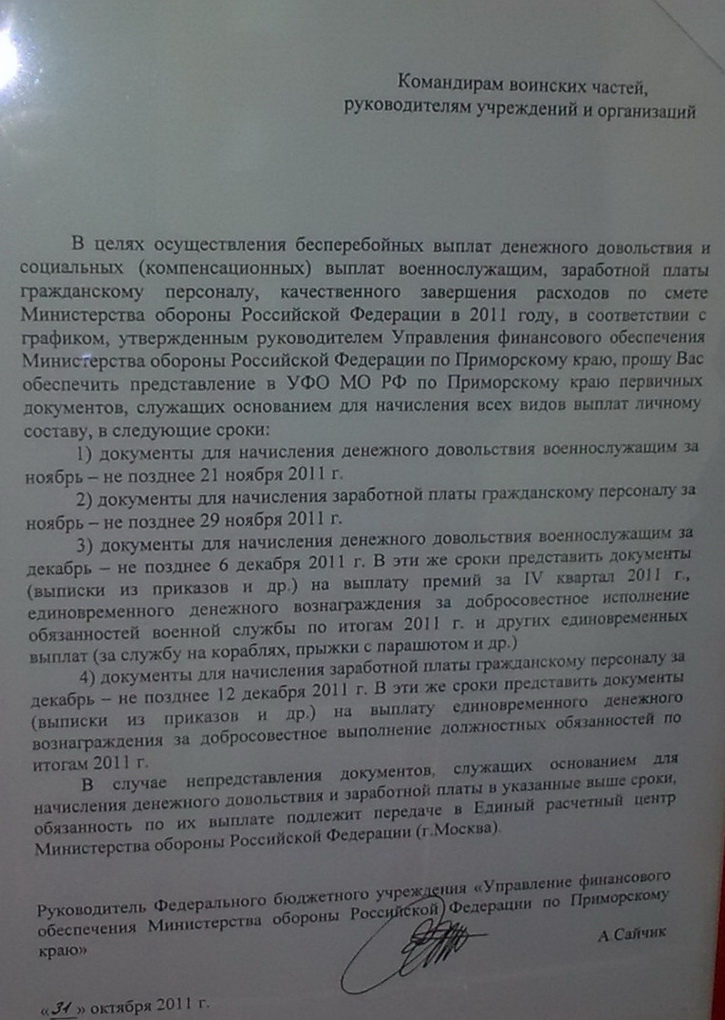 Документы для начисления заработной платы гражданскому персоналу за декабрь представить не позднее 12 декабря. Это что-то новенькое. Как они табеля заполнят на 3 недели вперед, если заболеет или уволится вдруг кто-то? + гражданским отдельно начисляют ночные, праздничные, сверхурочные и еще кучу всяким надбавок и доплат, которые можно начислить только по факту выполнения работы. Да и выплачивать ЗП гражданским за декабрь возможно раньше только исключительно по решению МО РФ, в ином случае нецелевое расходование ден.средств. Чувствую ЕРЦ похлеще ДЖО (РУЖО) чудить начнет со след. года, да и доступа туда нет.Сроки подачи документов на ДД и зарплаты за 2011г:
