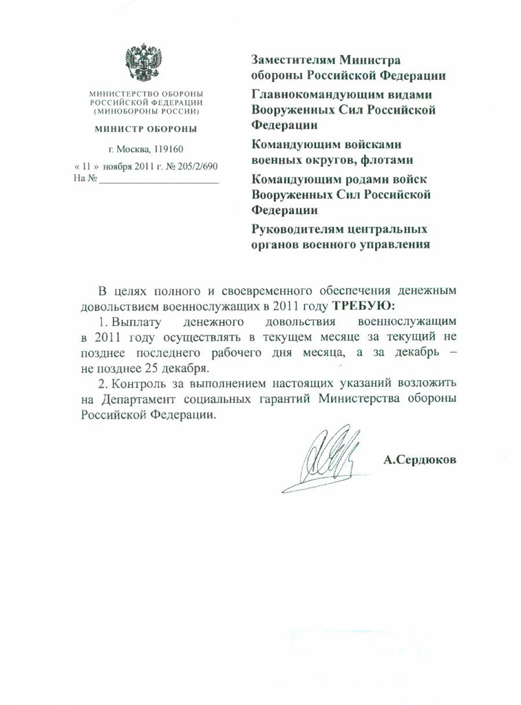 Министр обороны РФ своим приказом от 5 августа 2011 года № 1333дсп изменил сроки выплаты денежного довольствия военнослужащим.