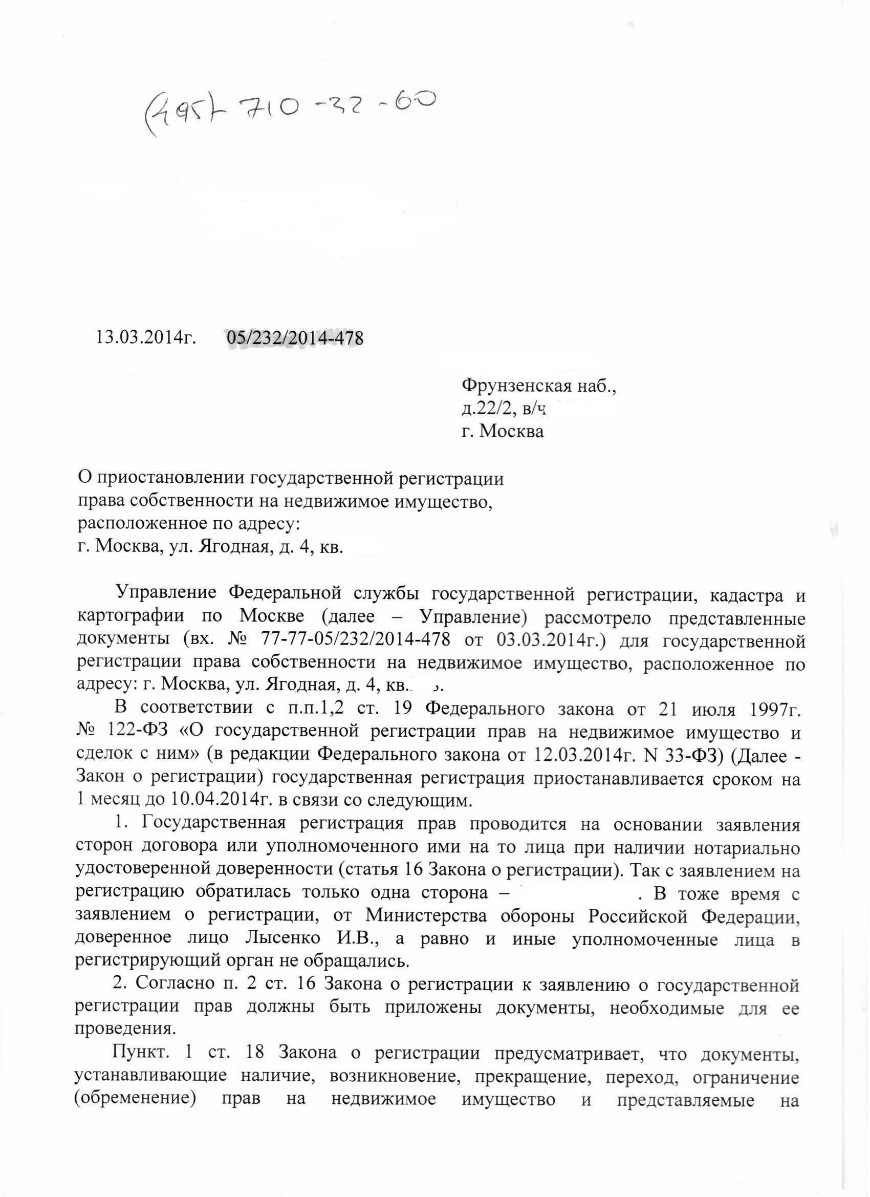 #1026720.12.13 г. получил отказ РР г. Москвы из-за ОУ. 17.03.14 г. подал заявление в суд на РР г. Москвы (не в г. Москве). Сегодня 26.03.14 г. выиграл суд в течении 15 мин. за одно заседание. У судьи вопросов не возникло. Жду апелляцию РР, т.к. просил вернуть 200 рублей.Подана апелляционная жалоба на решение Симоновского районного суда г. Москвы, которое покрывает решение Росрестра, ставя право оперативного управления выше права собственности и фактически лишая смысла предоставление в собственность военнослужащим жилья от имени государства, которое это же государство запрещает регистрировать в собственность. Основной довод апелляционной жалобы -