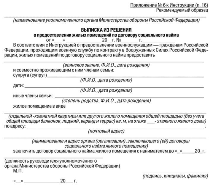 Выписки из решений о предоставлении жилых помещений по рекомендуемому образцу согласно приложению N 6 к настоящей Инструкции не позднее чем через три рабочих дня со дня их принятия направляются уполномоченным органом военнослужащим, принятым на учет нуждающихся в жилых помещениях, с уведомлением о вручении и органам (организациям), заключающим договоры социального найма жилого помещения с военнослужащими."