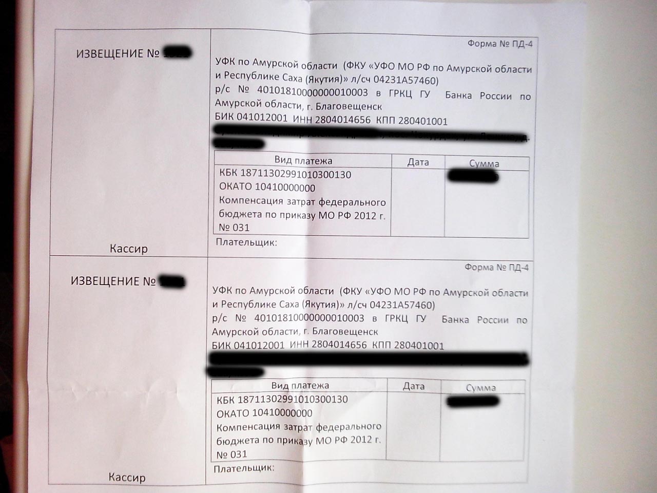 Кстати, подтверждаю, что в квитанции в графе "Вид платежа" указано "компенсация затрат ФБ по приказу МО РФ 2012 года № 031".