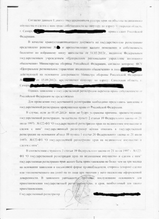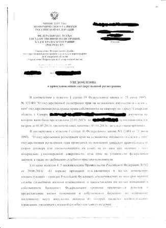 20 марта 2013 года получил уведомление о приостановлении государственной регистрации (Пушкинский Росреестр по Санкт-Петербургу)по следующим обстоятельствам: Возникновение сомнения в наличии оснований для государственной регистрации прав, предусмотренные п.1 ст.20 122-ФЗ - абз.1, п.1 ст.19 122-ФЗ (По сведениям Единого государственного реестра права на вышеуказанную квартиру зарегистрировано право собственности Российской Федерации и право оперативного управления ФГУ «Специальное территориальное управление имущественных отношений» Министерства Обороны РФ. Выписка о предоставлении жилого помещения в собственность военнослужащих и членов их семей согласно Постановлению Правительства РФ от 29.06.2011 №512 «О порядке признания нуждающимися в жилых помещениях военнослужащих-граждан РФ, обеспечиваемых на весь сроквоенной службы служебными жилыми помещениями, и предоставления им жилых помещений в собственность бесплатно» является основанием для прекращения права собственности Российской Федерации. Между тем, заявление от уполномоченного представителя ФГУ «Специальное территориальное управление имущественных отношений» Министерства Обороны РФ на прекращение права оперативного управления в отношении данной квартиры, в порядке п.1 ст.16 Федерального закона от 21.07.1997 №122-ФЗ «О государственной регистрации прав на недвижимое имущество и сделок с ним», на государственную регистрацию не представлено).