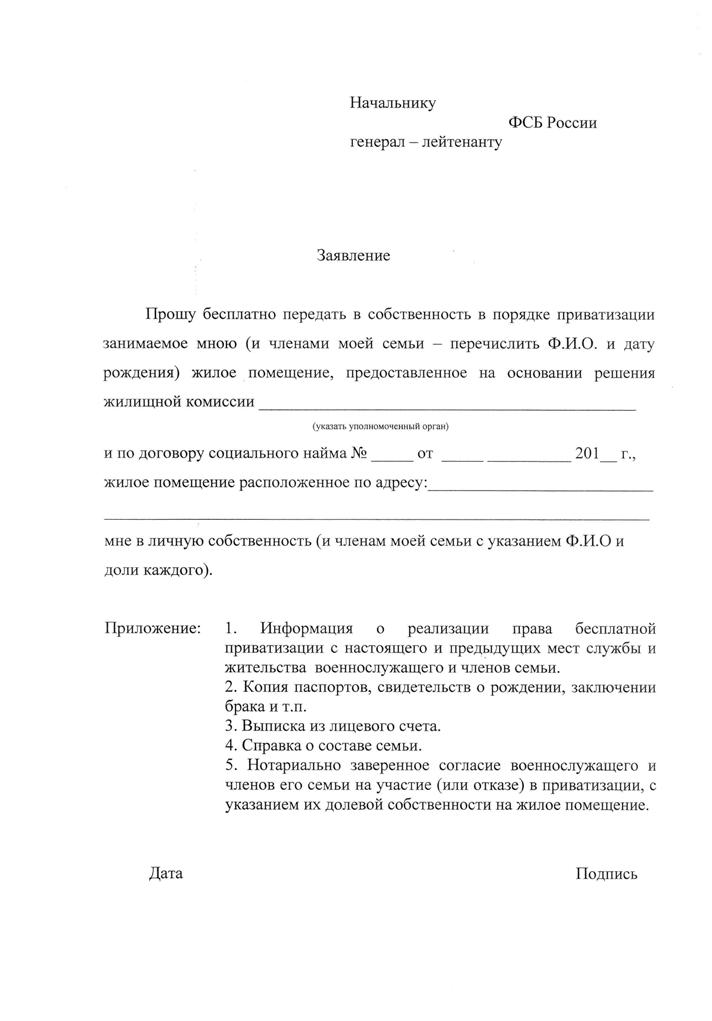 Согласно п.п.3-6 «Правил предоставления военнослужащим - гражданам РФ, обеспечиваемым на весь срок военной службы служебными жилыми помещениями, жилых помещений в собственность бесплатно», утвержденных Постановлением Правительства РФ от 29 июня 2011 г. № 512, прошу Вас: