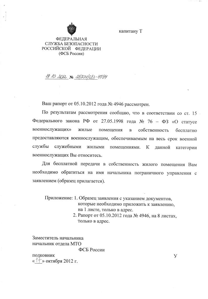 Ваш рапорт рассмотрен. По результатам рассмотрения сообщаю, что в соответствии со ст.15 ФЗ от 15.05.1998 №75 "О статусе военнослужащих" жилые помещения в собственность бесплатно предоставляются военнослужащим, обеспечиваемым на весь срок военной службы служебными жилыми помещениями. К данной категории Вы относитесь. Для бесплатной передачи в собственность жилого помещения Вам необходимо обратиться на имя начальника управления с заявлением (образец прилагается)"
