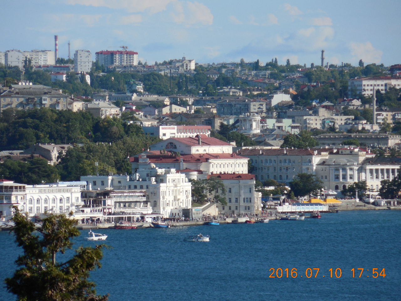 Так смотрится главный корпус БО "Севастополь" с Артбухбы г.Севастополя (съемка с набережной с максимальным приближением объектива):