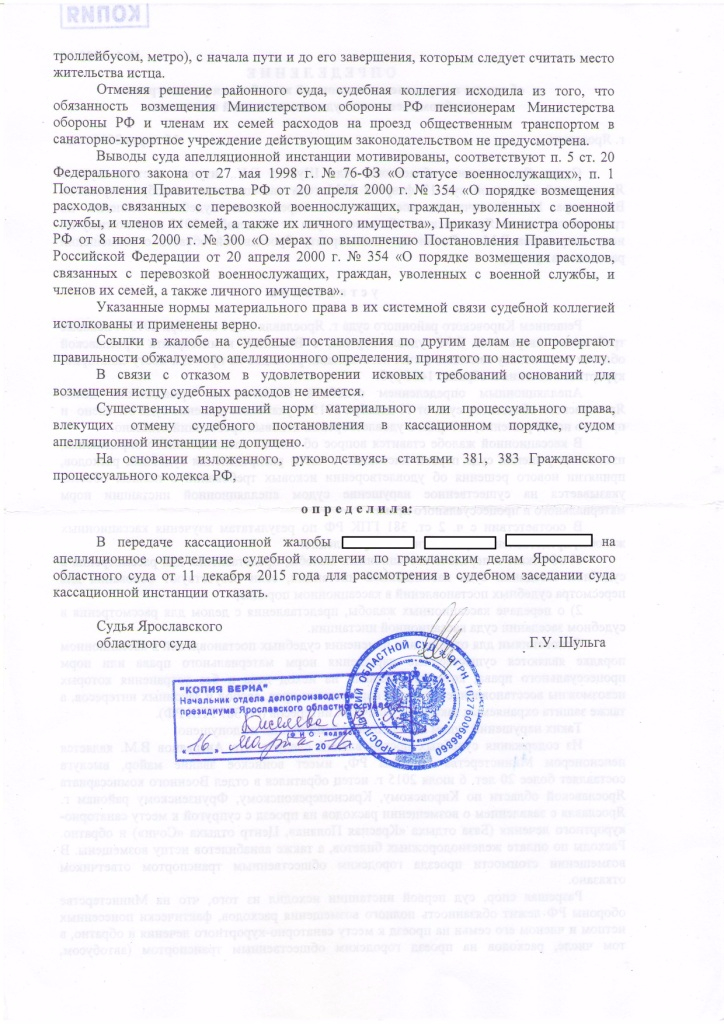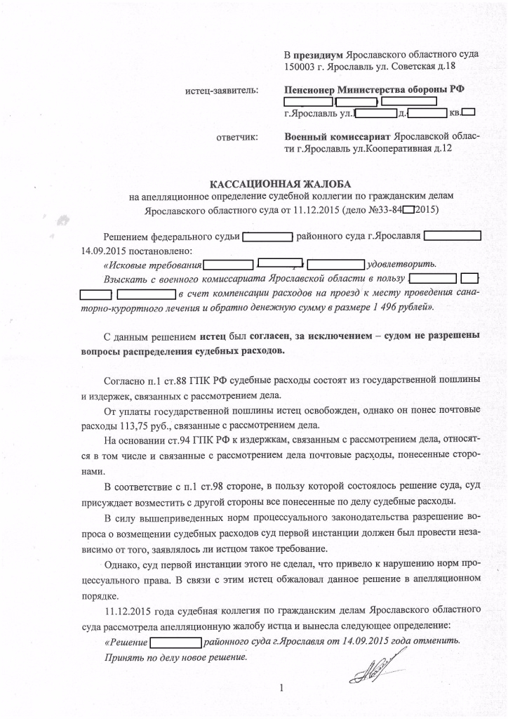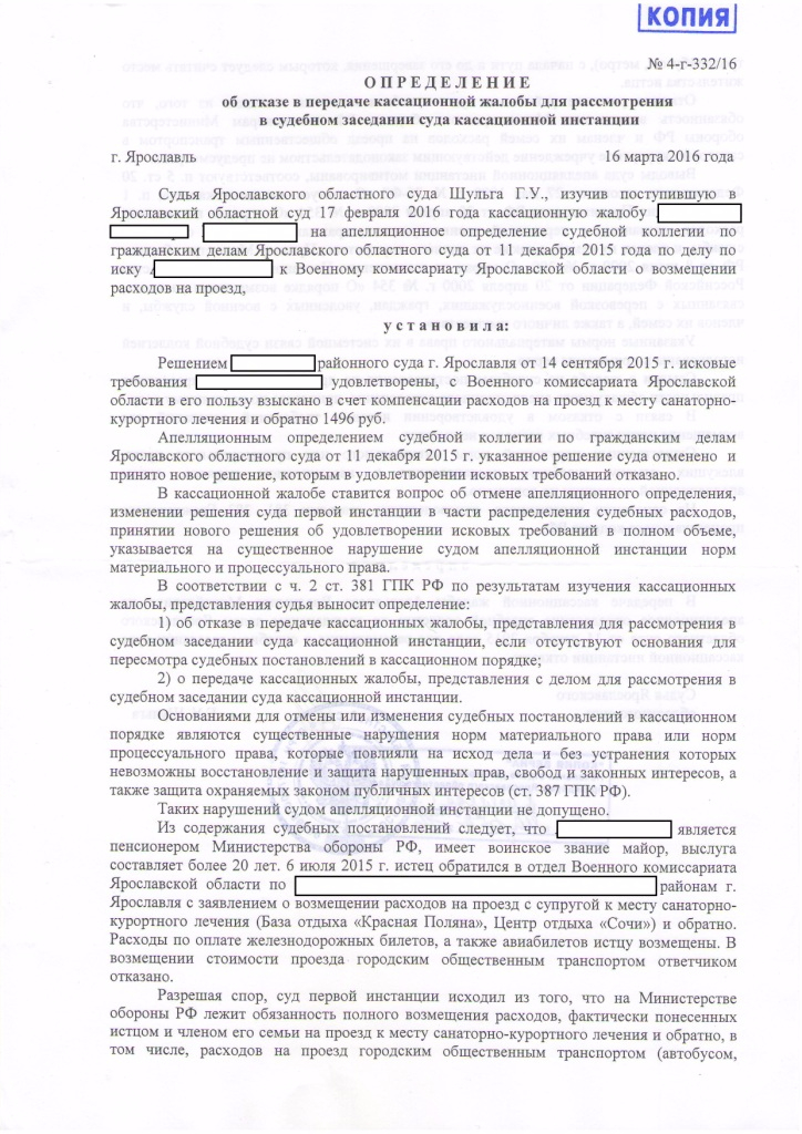 Я подал Кассационную жалобу в Президиум областного суда по гражданским делам. Сегодня почтальон принес Определение которым мне отказано в ПЕРЕДАЧЕ МОЕЙ КАССАЦИОННОЙ ЖАЛОБЫ НА ЕЕ РАССМОТРЕНИЕ В КАССАЦИОННОМ СУДЕ. Причина, как я понял, апелляционный суд и кассационный суд считают, что ЗАКОНОМ НЕ ПРЕДУСМОТРЕНО ВОЗМЕЩЕНИЕ РАСХОДОВ НА ПРОЕЗД ГОРОДСКИМ ОБЩЕСТВЕННЫМ ТРАНСПОРТОМ.
