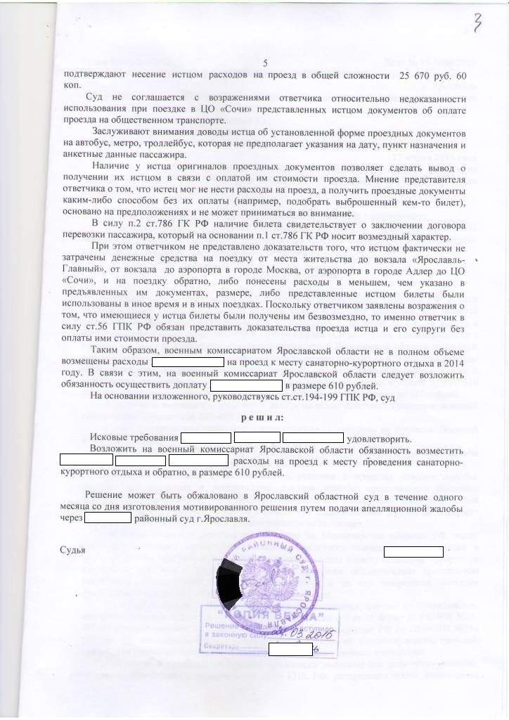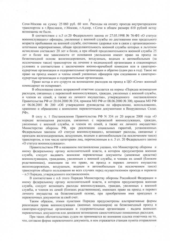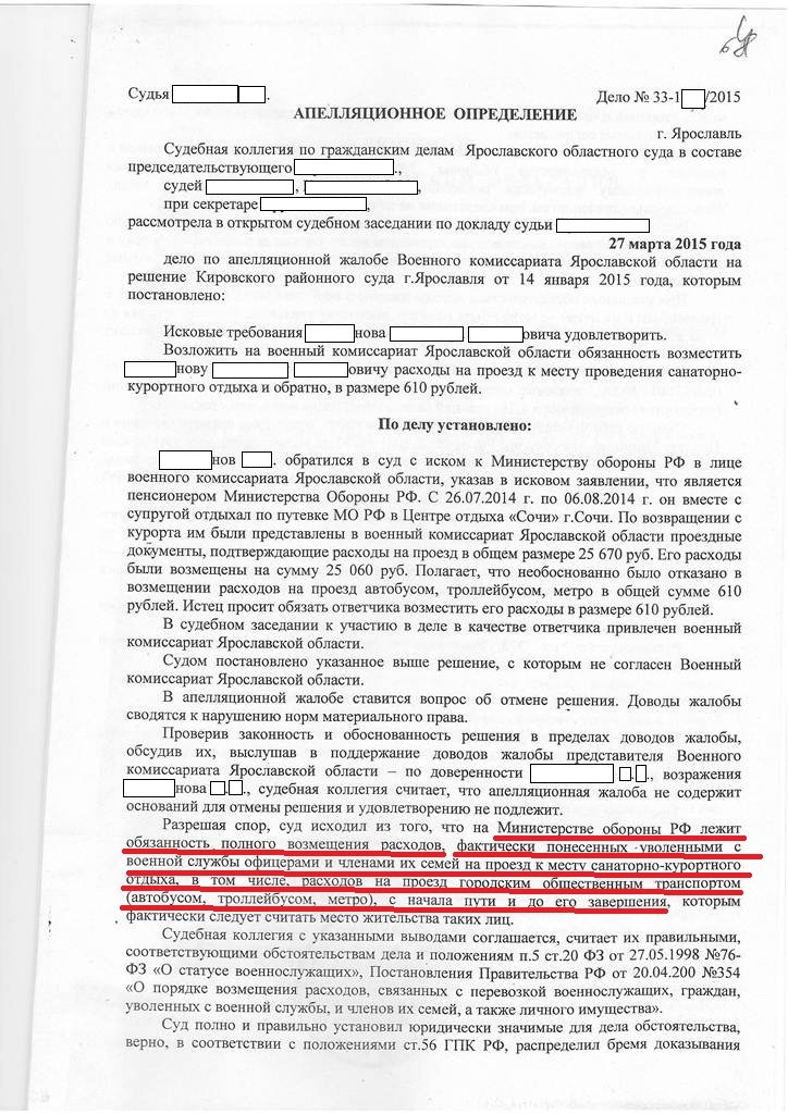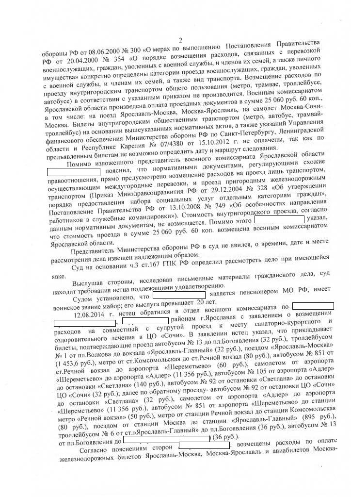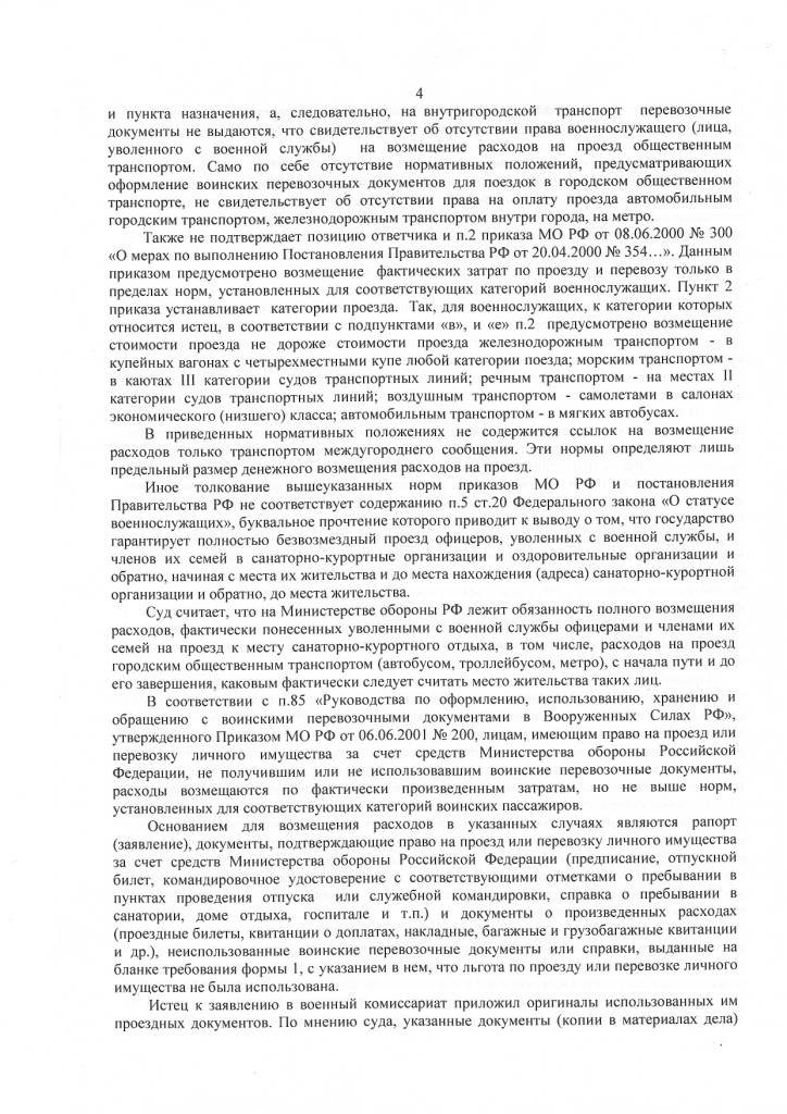 А про возмещение, что должно возмещаться- см. Приказ МО РФ № 300-2000. - В нём таких ограничений нет. В мотивировочной части решения суда, которое выше выложил Етитма, написано , что этот приказ, а точнее то, что в нём не предусмотрена выдача ВПД на все виды транспорта, не является основанием для невозмещения фактически понесённых расходов военным пенсионером по проезду в санаторий (см. 1 абзац стр.4).