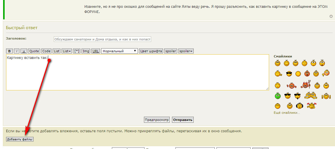 #9711На сайте Ялты окошко для сообщений закрыто, надеюсь только на заявление...Что-то непонятно, в какой папке (закладке, теме) FAQ это искать.Читайте FAQ на этом сайте. Там написано как вставлять изображения.QR_BBPOST Спасибо. Но имелось в виду копирование картинки в поле сообщения на данном форуме.