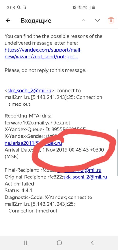 #9720Отправлял два письма (себе и товарищу) с разных адресов на первой минуте в "Севастополь". На мое пришел ответ о доставке, на его - нет. 2-го дозвонился до отдела распределения и просил проверить доставку письма. Сказали, что сейчас не могут, не волнуйтесь, так бывает - все нормально. Повторно посылать не стал. Только сегодня пришло сообщение почтового сервера о недоставке (спустя более чем трое суток). Причина: Connection timed out. Очень неприятно, что по телефону отмахнулись, а дни потеряны. Надо было отправлять повторно хотя бы на следующий день. Сделал это только сейчас, питаю надежду, что база отдыха все-таки не санаторий...