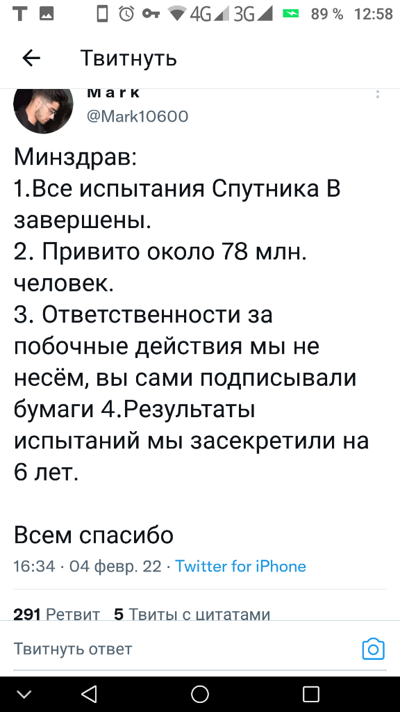 #3218Третьим лицамМинздрав РФ отказался публиковать данные клинических испытаний вакцины от коронавируса «Спутника V», сославшись на коммерческую тайну. Минздрав указал на то, что данные регистрационного досье содержат конфиденциальную информацию, поэтому не могут быть предоставлены третьим лицам без согласия разработчика.