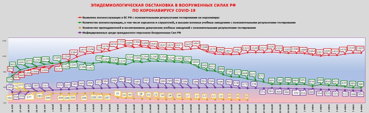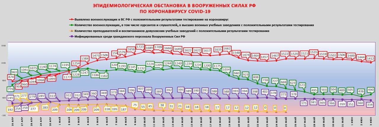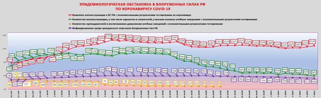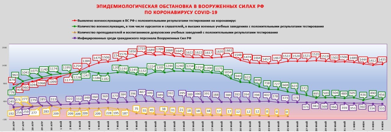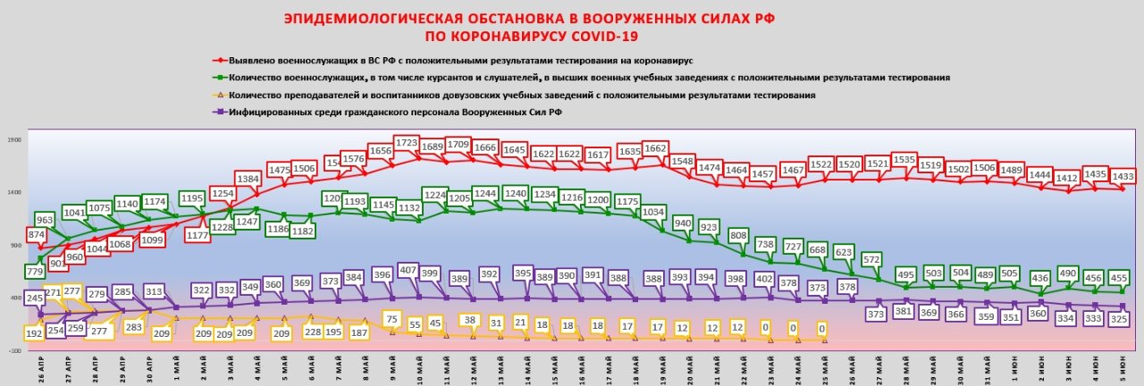 Шойгу: ... Пик заболеваемости новой коронавирусной инфекцией в Вооружённых Силах преодолён во второй половине апреля. Всего с начала марта в Вооружённых Силах были инфицированы 5,5 тысячи человек. На сегодняшний день вылечены и выписаны 3,5 тысячи. К началу июня обстановка в Вооружённых Силах войдёт в состояние плановой.