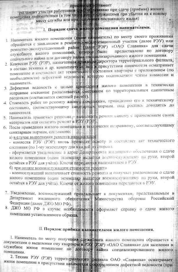 Распоряжение ООО «Славянка» от 24 октября 2011 г. о Временном регламенте участия работников ООО «Славянка» при сдаче (приемке) жилого помещения нанимателями (в том числе военнослужащими при убытии их к новому месту службы или при получении постоянного жилья).