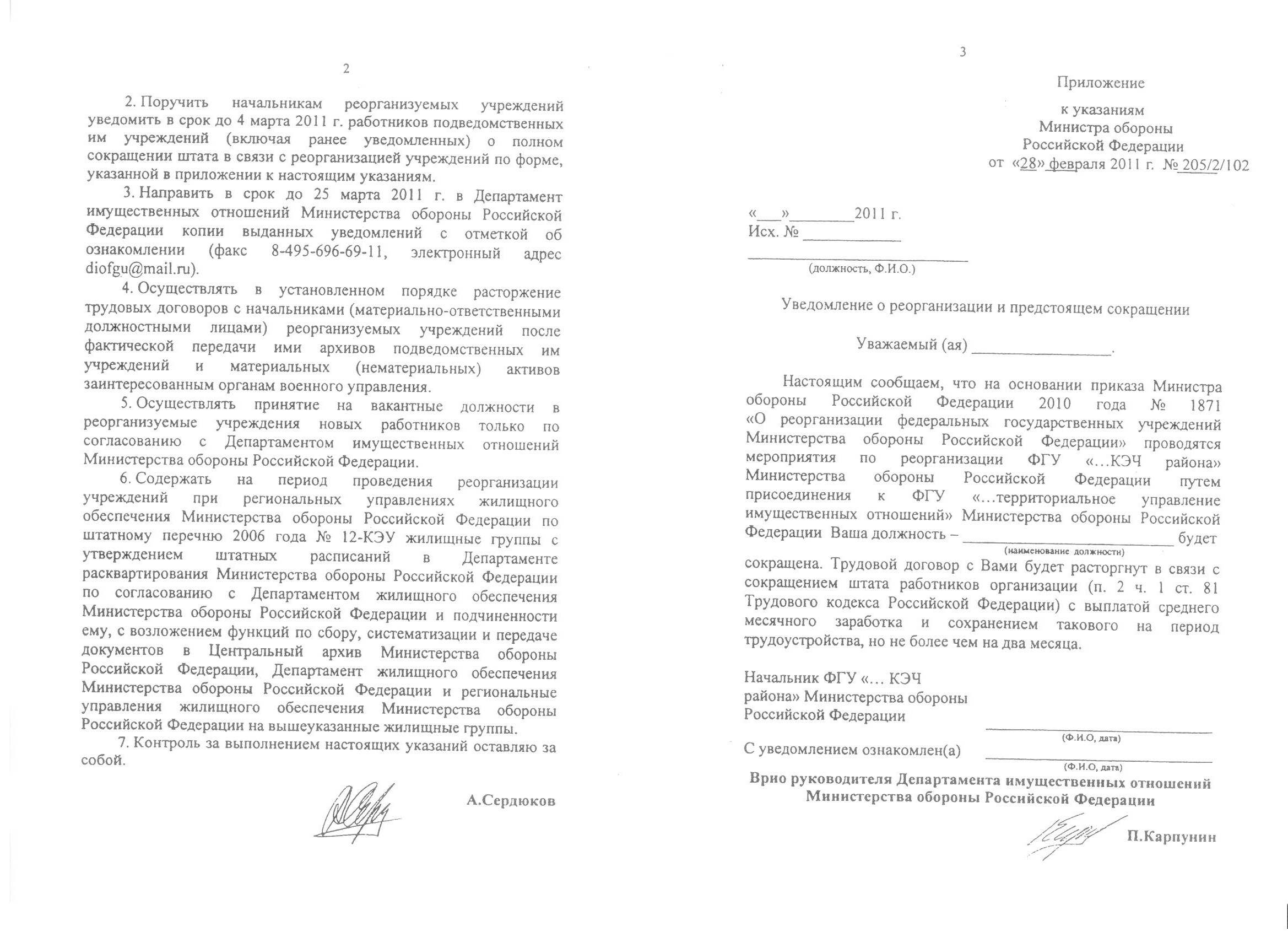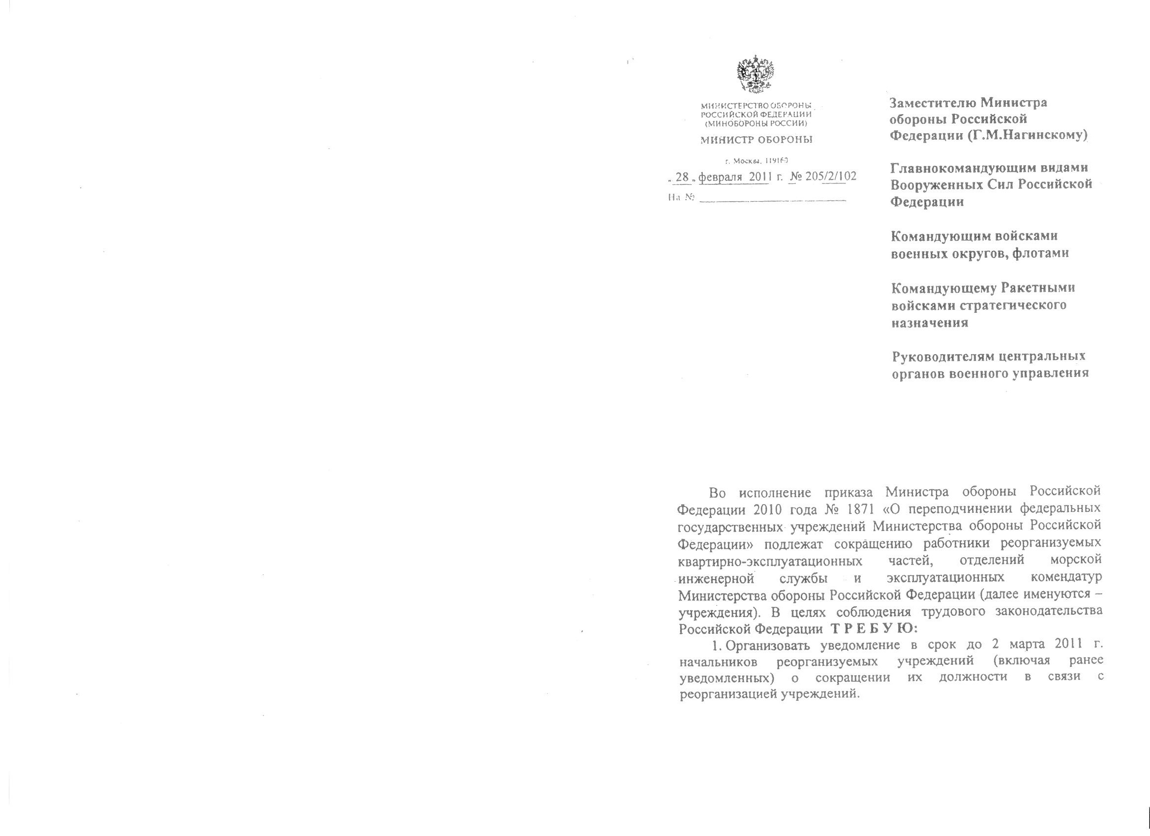 Указание Сердюкова (о реорганизации КЭЧ районов, ОМИС) от 28.02.2011 года №205/2/102: