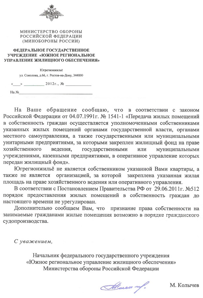 То есть, вместо того, чтобы помочь нам быстрее приватизировать квартиры, ДЖО предлагает... судиться с родным военным ведомством. А меж тем, бесплатная приватизация заканчивается 1 марта 2013 года, - осталось 7 недель! А если учитывать, что сроки рассмотрения судебных дел тянутся 2- 3 месяца (а тут еще и январские каникулы!), то служивым вполне грозит платная и дорогостоящая приватизация квартир. Что грубейшим образом нарушает узаконенные права людей в погонах.