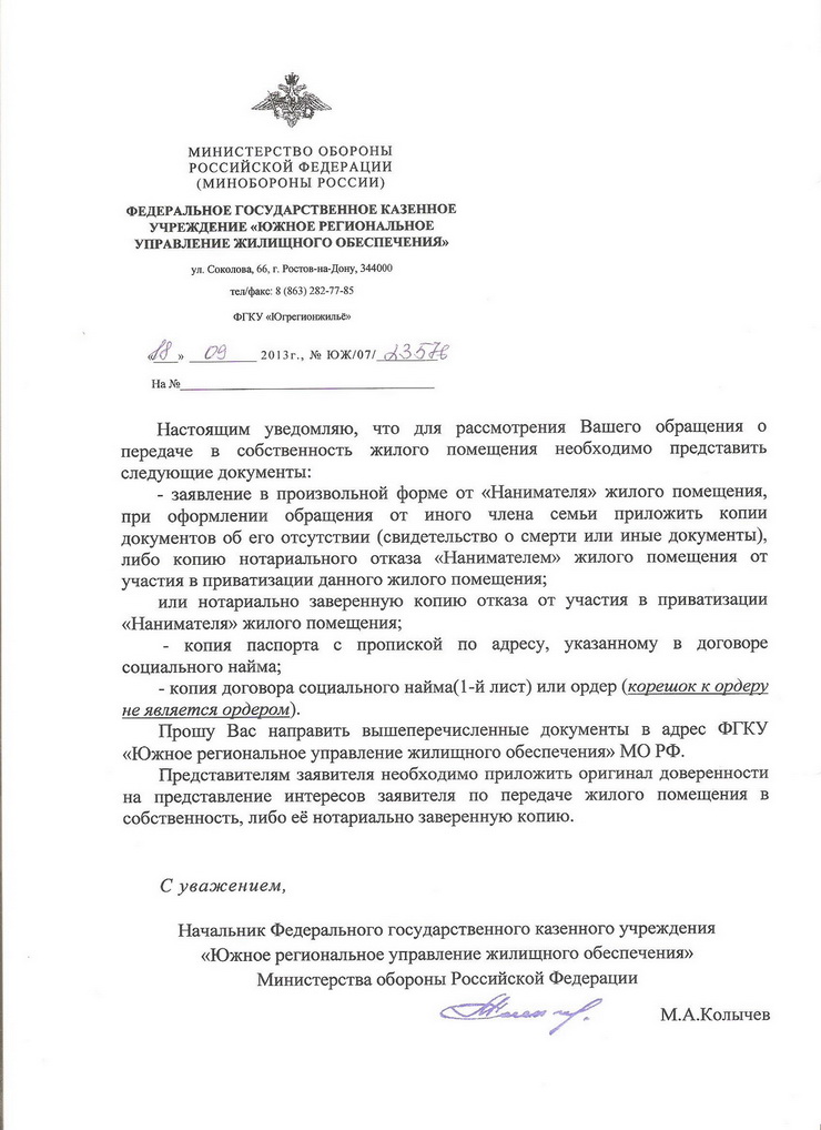 #14030Вообще-то Колычев реформатор Он ведь чуть чуть рулил ДЖО. Может здесь что-то знает по поводу договора передачи в собственность? Хотя на Горячей линии ДЖО сказали что адм регламент не предвидится .Всем добрый день. Отправил два стандартных запроса в СТУИО и Югрегионжилье на приватизацию. Из Москвы ожидаемо-в суд, а из Ростова предложили прислать некоторые копии для рассмотрения вопроса. У меня 1-й контракт до 98-го года. Что значит сей ответ? Вроде был разговор о формировании группы для рассмотрения таких дел (может даже на будущее) или просто это ответ для 1998 г+