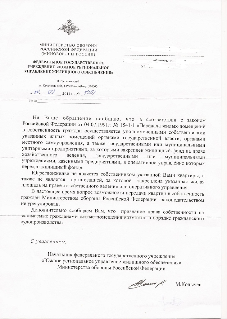 А ответ то где?В Ростове вообще ДСН заключают с РУЖО, а на заявление по приватизации прислали ответ