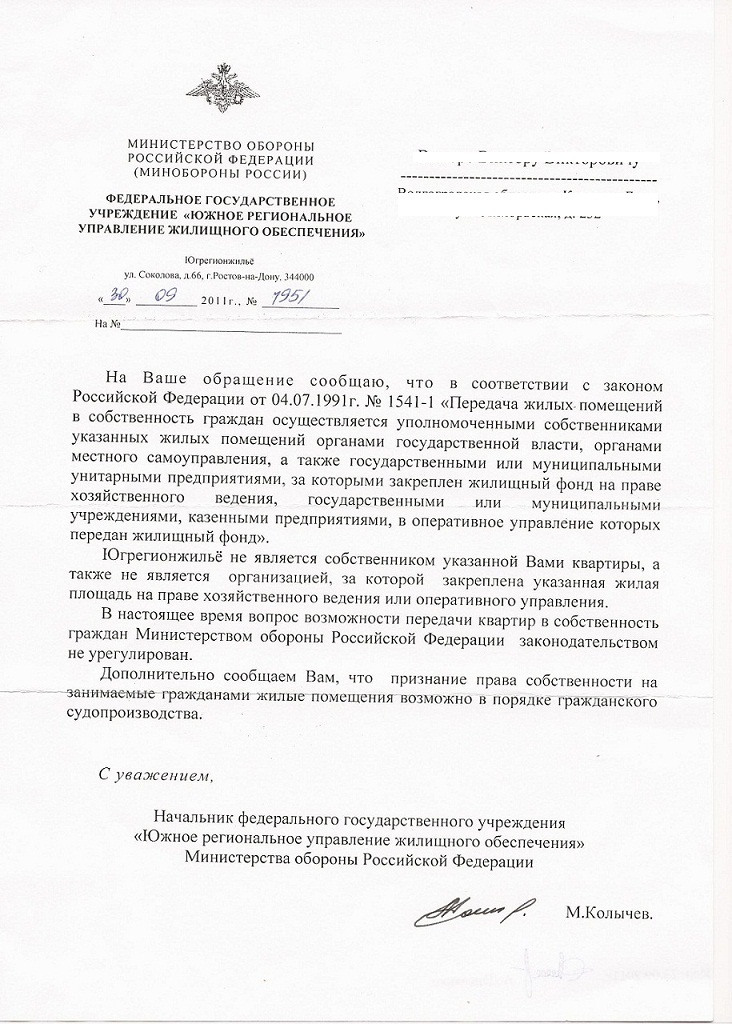 4. В настоящее время вопрос передачи военнослужащим жилых помещений в собственность бесплатно в Министерстве обороны Российской Федерации до конца не урегулирован, в частности: