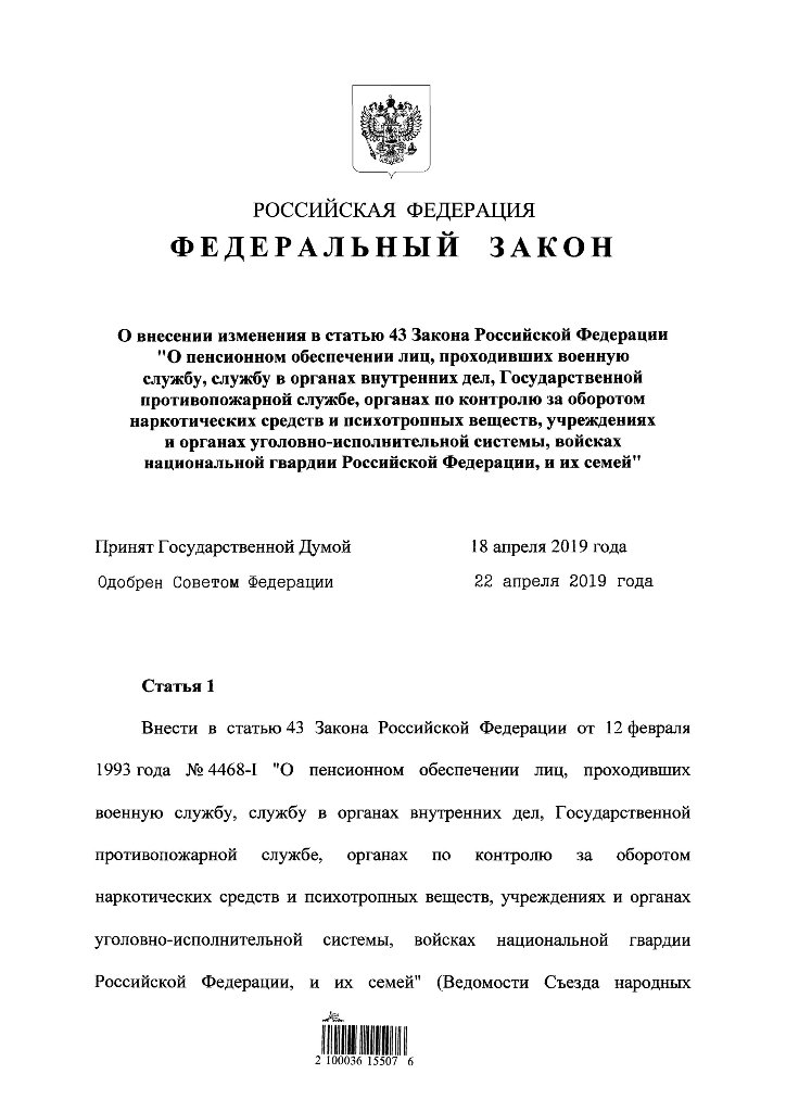 "О внесении изменения в статью 43 Закона Российской Федерации "О пенсионном обеспечении лиц, проходивших военную службу, службу в органах внутренних дел, Государственной противопожарной службе, органах по контролю за оборотом наркотических средств и психотропных веществ, учреждениях и органах уголовно-исполнительной системы, войсках национальной гвардии Российской Федерации, и их семей"