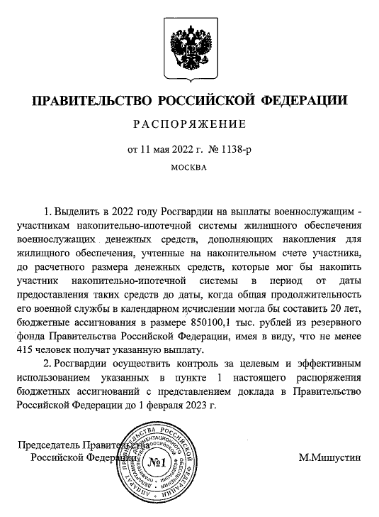 Постановлением Правительства РФ Росгвардии РФ выделены денежные средства дополняющие накопления по военной ипотеке из расчета на 415 человек.
