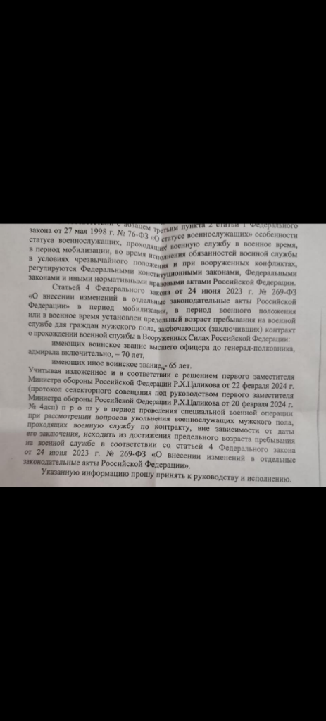 #3383Здравствуйте. Я уточню своё предыдущее сообщение. В первых трёх статьях указано куда вносятся имения, в четвёртой - нет. Ниже привожу текст. Возможно это как-то поможет тем, кто будет отстаивать своё право на увольнение по предельному возрасту нахождения на военной службе.Ну неправда ведь... всё там сказано куда вносится!Здравствуйте. По поводу ФЗ № 269. Его полное название " Федеральный закон от 24 июня 2023 г. N 269-ФЗ "О внесении изменений в отдельные законодательные акты Российской Федерации". Но в нём нет информации о том, в какой закон вносятся изменения. В ст. 4 тоже нет сведений о том, в какой законодательный акт вносятся изменения. "Вносим поправки но мы вам не скажем куда". Это вообще как понимать?