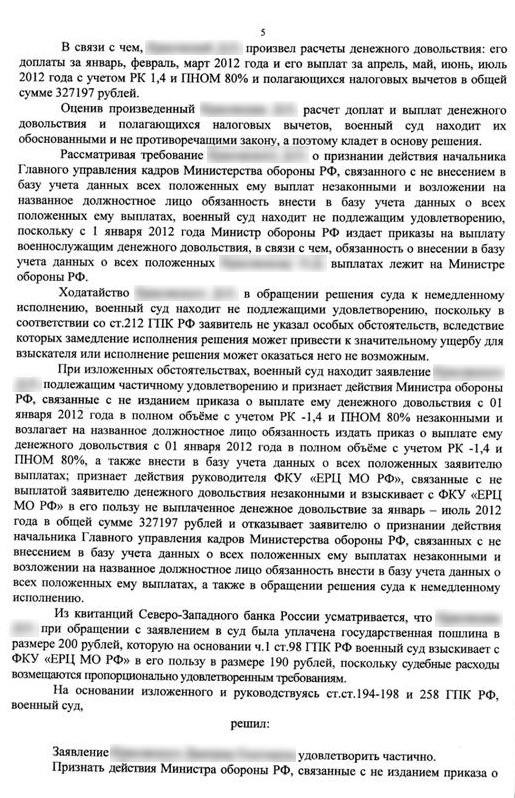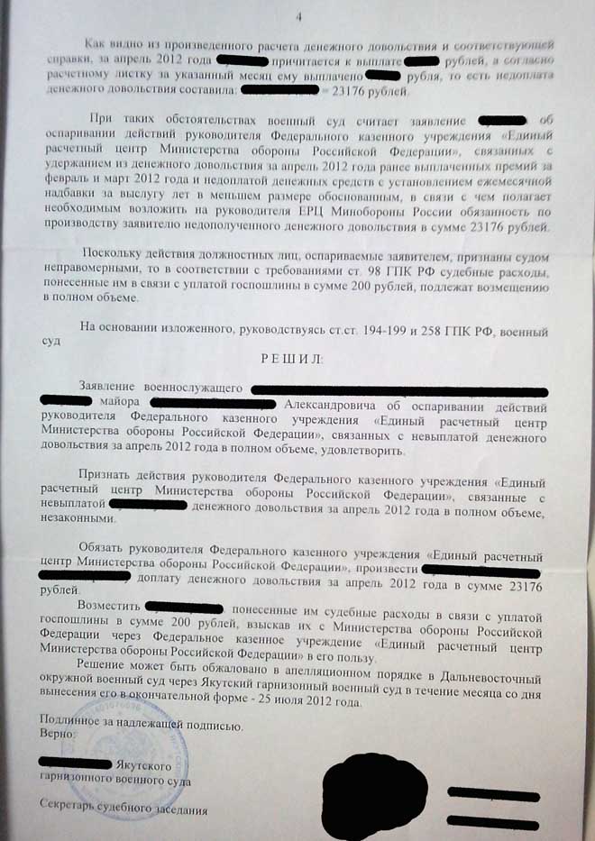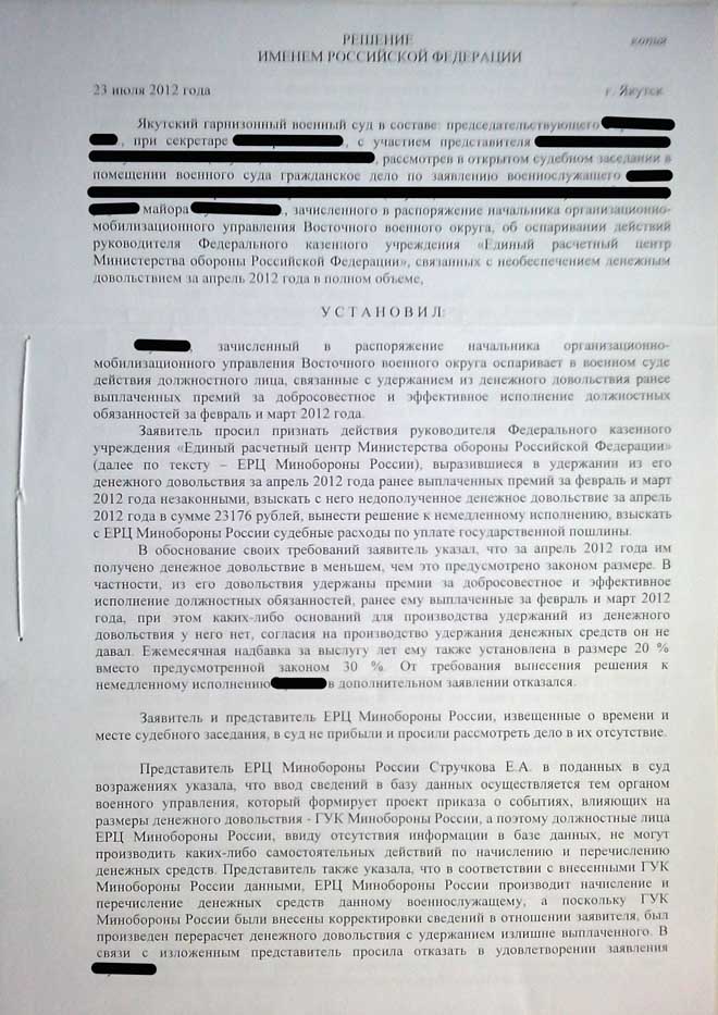 Сегодня забрал решение суда, который рассматривал мое заявление по факту удержания с моего денежного довольствия за июль 2012 г., "незаконно" переплаченных мне денежных средств с января по июнь 2012 г. А, именно, надбавок за секретку, классность и ос.условия в.службы.