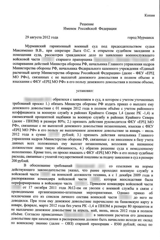 Прилагаю решение Мурманского гарнизонного военного суда по моей жалобе.