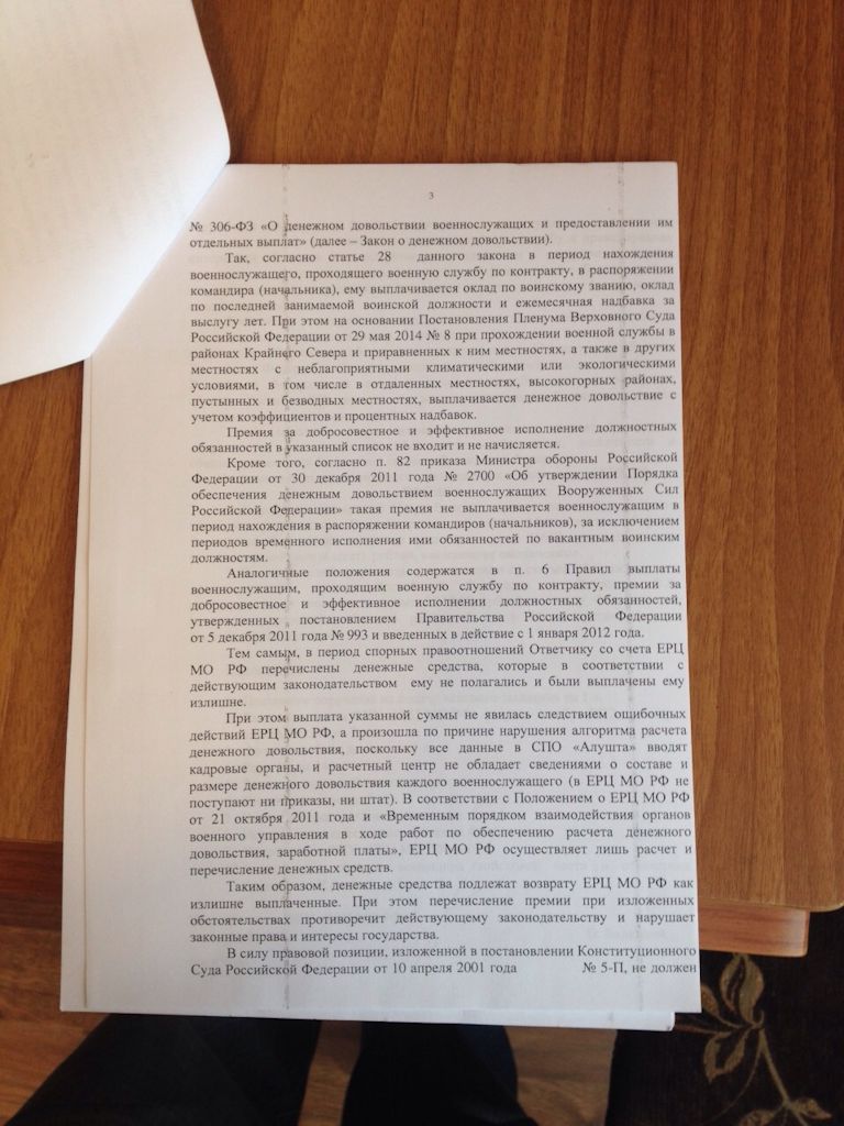 Кассацию еще сочиняю, есть 5 месяцев. Вечером отсканирую, выложу решение и определение, хотя там одна вода. Суть - Своим решением Солнечногорский ГВС посчитал, что повышающий коэффициент 1,2 входит в мой оклад денежного содержания, и обязал начальника ГУК МО РФ внести изменения в базу данных ЕРЦ МО РФ для начисления мне денежного довольствия с учетом квалификационной категории «Военный летчик 1 класса», с учетом повышающего коэффициента 1,2 оклада денежного содержания. Начальник ГУК МО РФ 18.02.2013г. решение Солнечногорского ГВС исполнил, внес изменения в базу данных «Алушта», так же были внесены изменения в Приказ Министра обороны РФ №26 от 25.01.2012г., в котором указан повышающий коэффициент 1,2 оклада моего денежного содержания. Приказ ГК ВВС №179 от 16.10.2014г., в котором он так же указал о повышающем коэффициенте 1,2 моего оклада денежного содержания, все вышеприведенные акты не отменены на данный момент. На дату решения Солнечногорского суда ЕРЦ выплатил данную надбавку и далее прекратил выплачивать, хотя ничего ни в законе, ни в моих служебных обязанностях не поменялось. Я подал заявление в суд на Руководителя ЕРЦ, МГВС и МОВС обосновали свой отказ в моих требованиях тем, что я в распоряжении, не летаю, соответственно не имею право на эту надбавку. Так же не были приняты к сведению судами то, что пенсионеры тоже не летают, а данную надбавку получают и что Заместитель руководителя Департамента финансового планирования МО РФ от 01.06.2012г.№180/4/8578 указал - при увольнении военнослужащих летного состава, проходящих военную службу по контракту, имеющих присвоенные в установленном порядке квалификационные разряды, в том числе, находящиеся в распоряжении командиров, в расчет единовременного пособия при увольнении принимаются оклады по соответствующей должности с учетом повышающих коэффициентов, так же не захотели руководствоваться единством судебной практики, т.к. в соответствии с ч. 2 ст. 61 нашел аналогичные решения, но в пользу заявителя. Что получилось в моем случае - Министр обороны внес изменения в приказ, ГУК внес изменения в Алушту, ГК ВВС так же в приказе о включении в списки части указал про класс, а ЕРЦ не исполнило всех вышестоящих начальников приказы, а суды его узаконили, т.е. вмешались в нормотворческую деятельность Министерства обороны, что не допускает ст. 10 Конституции РФ.В студию все три судебных акта.