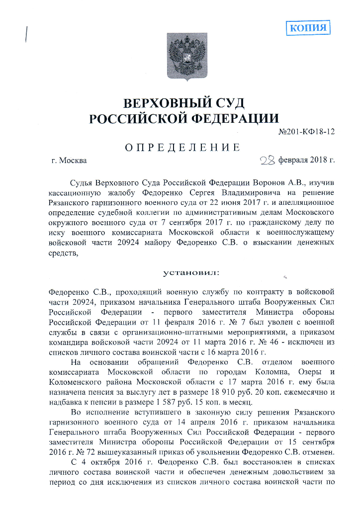 Поэтому, может не подавать заявление непосредственно в военкомате, а отправлять им почтой с приложением всех требуемых копий документов, указав, чтобы письменно сообщили о принятом решении? В случачае отказа (не ответа) -обжаловать. Но здесь военкомат, наверное, будет максимально затягивать с решением и выплатой. Хотя и при обычной подачи заявления в военкомате, первое начисление ОВЗ произвели уже после апелляционного определения о восстановлении на службе.
