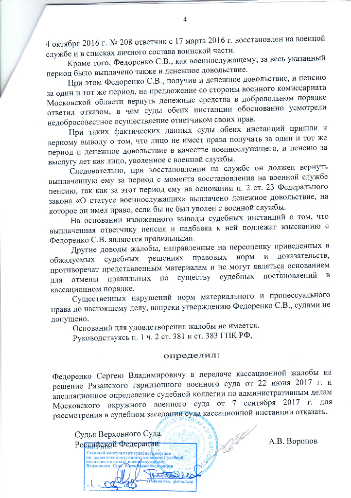 Аналогичные положения содержатся в ч.4 ст.137 Трудового кодекса Российской Федерации и в п.6 Порядка обеспечения денежным довольствием военнослужащих Вооруженных Сил Российской Федерации, утвержденного Приказом Министра обороны Российской Федерации от 30 декабря 2011 года №2700, согласно которому денежное довольствие, выплаченное в порядке и размерах, действовавших на день выплаты, возврату не подлежит, если право на него полностью или частично военнослужащими впоследствии утрачено, кроме случаев возврата излишне выплаченных сумм вследствие счетных ошибок.