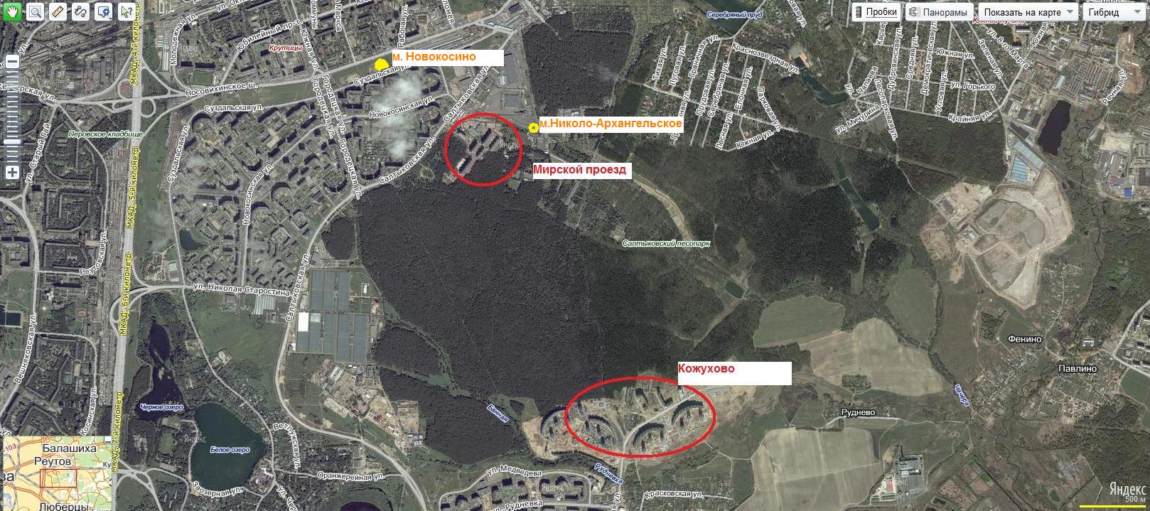 Место хорошее - 1,5 км от МКАД, с другой стороны улицы - московский район Новокосино. Через полтора года завершается строительство ст. метро "Новокосино", до которой от Мирского менее 700 м. Следующая запланированная станция - "Николо-Архангельская" будет расположена непосредственно на границе городка. И только потом линия протянется в район Кожухово, в который так рвались желающие реализовать свое право на Москву очередники, с негодованием отвергая предложения по жилью в Мирском.