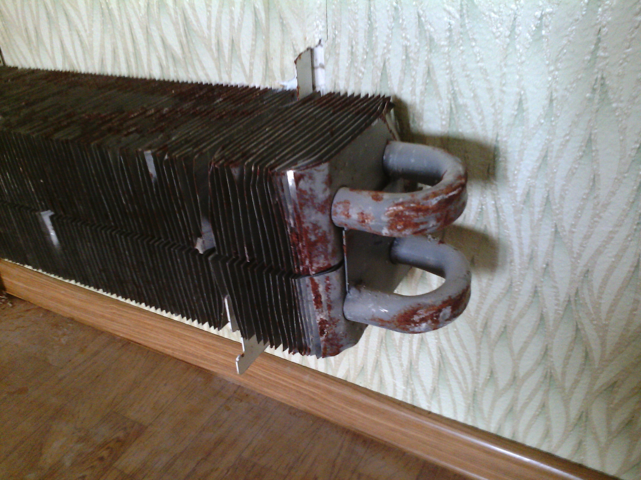Батареи когда-то были кое-как покрашены, но на трубах уже наблюдается очаговая коррозия: Функционально батареи вполне нормальные. Внешний вид с кожухом, да ещё за занавеской меня вполне устраивает. Менять не вижу смысла - пусть поработают.