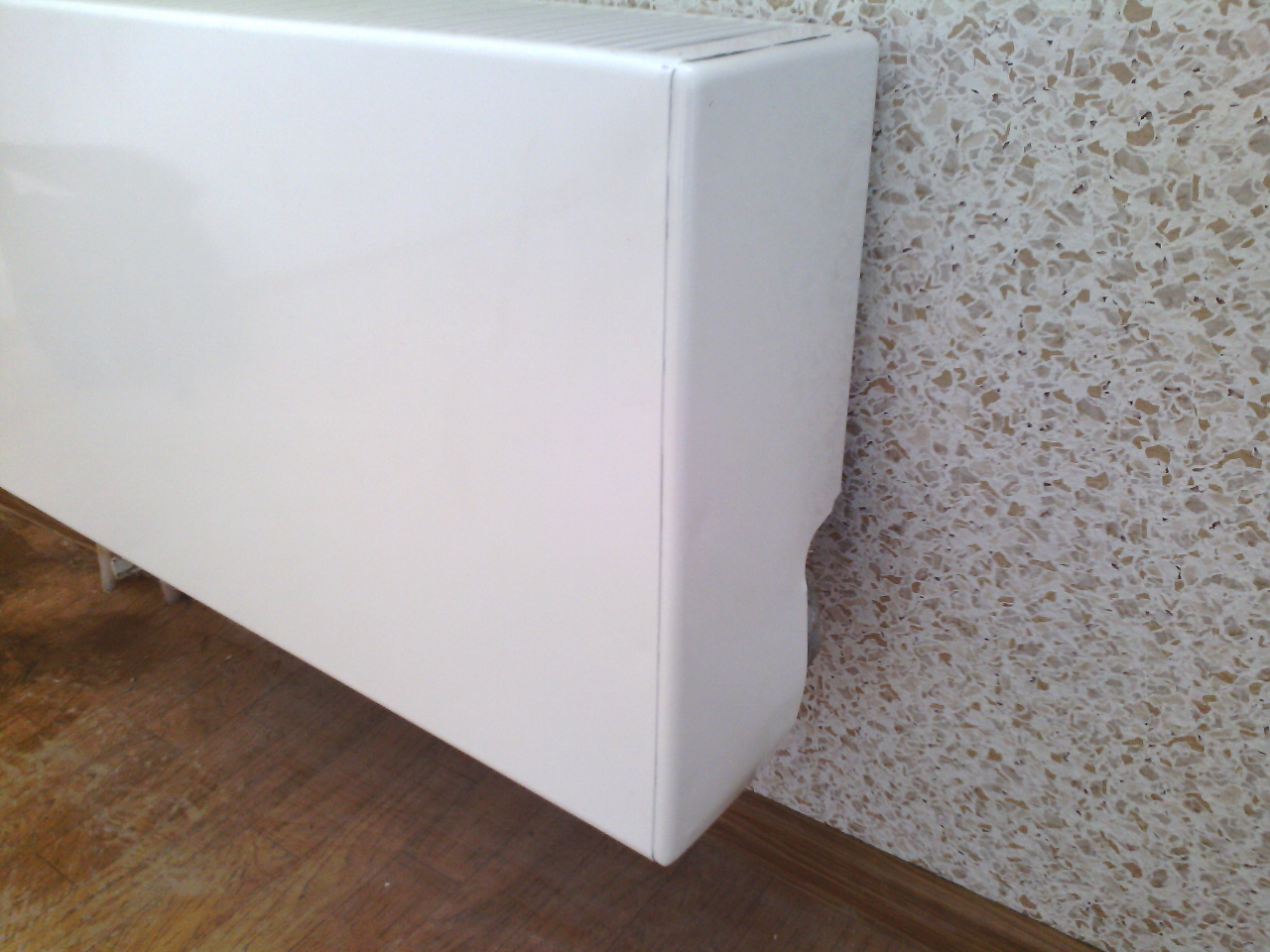 На фото деформацию плохо видно из-за отсвета эмали, но если приглядеться, то можно заметить. "Вживую" деформация кожухов бросается в глаза. Некоторые кожухи натягивали-натягивали, но не натянули, поэтому они висят криво: Сначала думал, что такие кожухи радиаторов во всех квартирах. Но в квартире выше этажом, в которую я зашёл, оказалось, что имеются кожухи на несколько сантиметров длиннее, которые устанавливаются на батарею без проблем и деформаций. В квартире выше этажом оказались кожухи четырёх типоразмеров, которые прекрасно подходили для соответствующих имеющихся батарей. В распределённой мне квартире были кожухи только двух типоразмеров. То есть имела место банальная пересортица и лень монтажников, которые не подбирали подходящий по размеру кожух, а просто "нахлобучивали" с деформацией то, что было под рукой.
