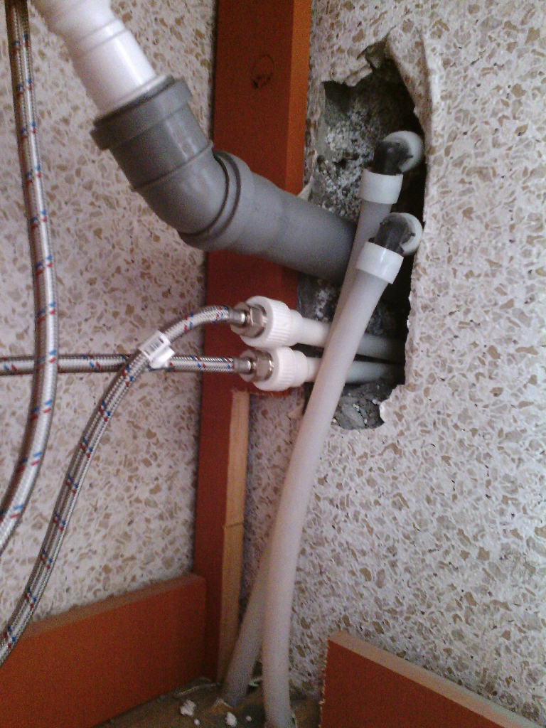 ПВХ-трубки, уходящие вертикально в пол, - это отопление кухни. Вот они поближе: Трубки отопления проложены неправильно, т.к. при заделке отверстия в стене (как это положено делать) соединения (уголки) окажутся под слоем штукатурки. Вертикальная часть трубок проходит слишком близко к стене, что, с одной стороны, не даст возможности нормально приклеить плитку, а с другой стороны - является прямым нарушением п. 3.3 СНиП 3.05.01–85 "Внутренние санитарно-технические системы".