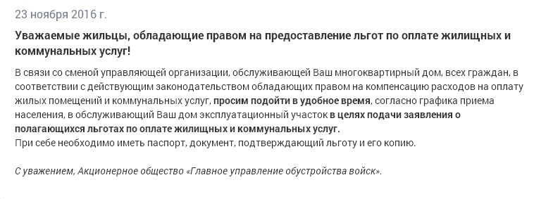 #27305То, что Вы пишите - различная система реализации социальных льгот. Раньше так и было. Мне указывалась сумма в квитанции, я оплачивал половину. Но тогда УК были муниципальными. Когда УК стали ОАО, то сразу от этой схемы отошли. Сначала платишь 100 % УК, а потом идет выплата компенсации. Но опять же это на усмотрение региональных властей (они определяют какие льготы пенсионерам давать). Деньги на выплаты федеральным льготникам приходят из федерального бюджета. Как это выглядит, сказать затрудняюсь. Может быть сначала регион оплачивает, а потом компенсация, может быть компенсация идет из центра сразу. Но единообразие подхода к выплатам сохраняется. Т.е. если в Москве - сначала оплата 100%, а потом компенсация, то это правило для всех и исключений нет.QR_BBPOST Только никаких выплат нет - весь перерасчет с учётом льгот сразу указывают в квитанции, такую сумму уже с учётом льгот оплачиваешь, и никаких выплат потом не получаешь, потому что ничего не переплачивал.