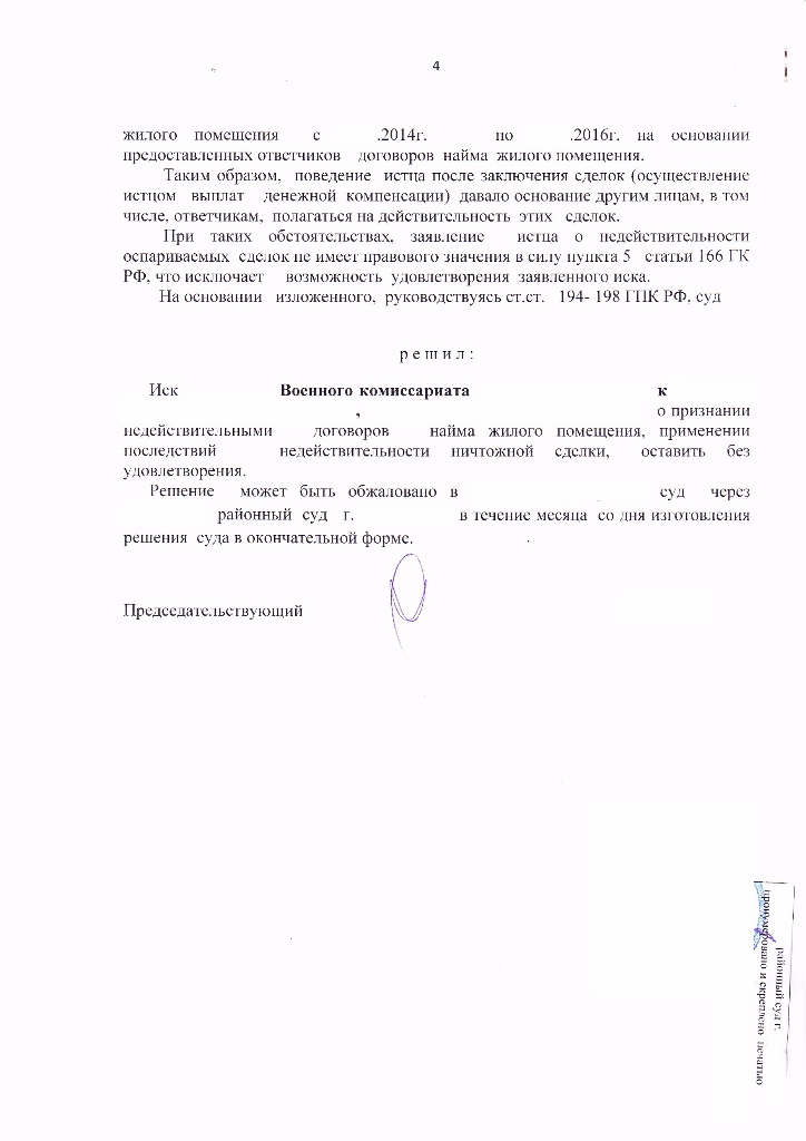 QR_BBPOST Решение районного суда об отказе в удовлетворении иска ВК о признании недействительными договоров найма жилого помещения, заключённых между красноармейцем и родственником, применении последствий недействительности ничтожной сделки...