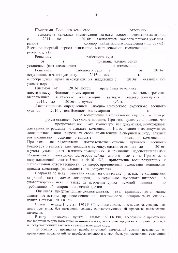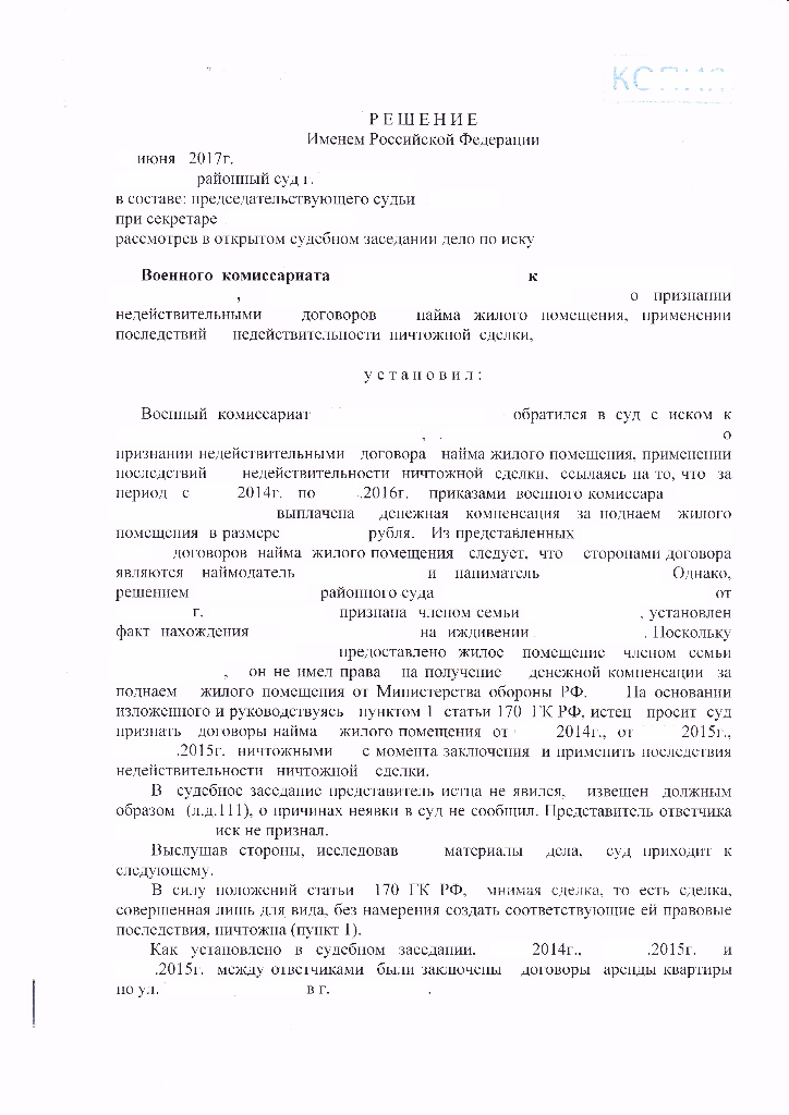 Решение районного суда об отказе в удовлетворении иска ВК о признании недействительными договоров найма жилого помещения, заключённых между красноармейцем и родственником, применении последствий недействительности ничтожной сделки...
