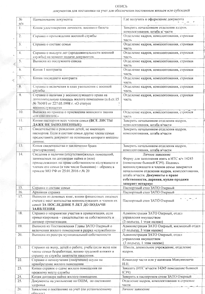 #39750Толик45, а не могли бы Вы сообщить дату Вашего признания нуждающимся в жилье, я тоже из Озёрного и доки обновлял в начале февраля 2017, вот жду теперь, сам признан нуждающимся в ноябре 2014, военпенс....Тверская область , предлагают осилить следующий список документов