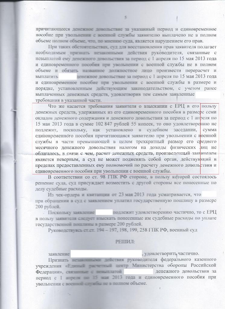 Ну вот я так и думал, не про то здесь немного в части налога. Суд естественно не может взять и выплатить , удержав налог. Он не налоговый агент, как он его перечислит.вот решение(5 и 6 стр прикрепляю), кстати исполнили в течении двух месяцев достаточно быстро, не ожидал я от ЕРЦ такой прыткости, видимо хорошая армейская п...а с нашей подачи помогла