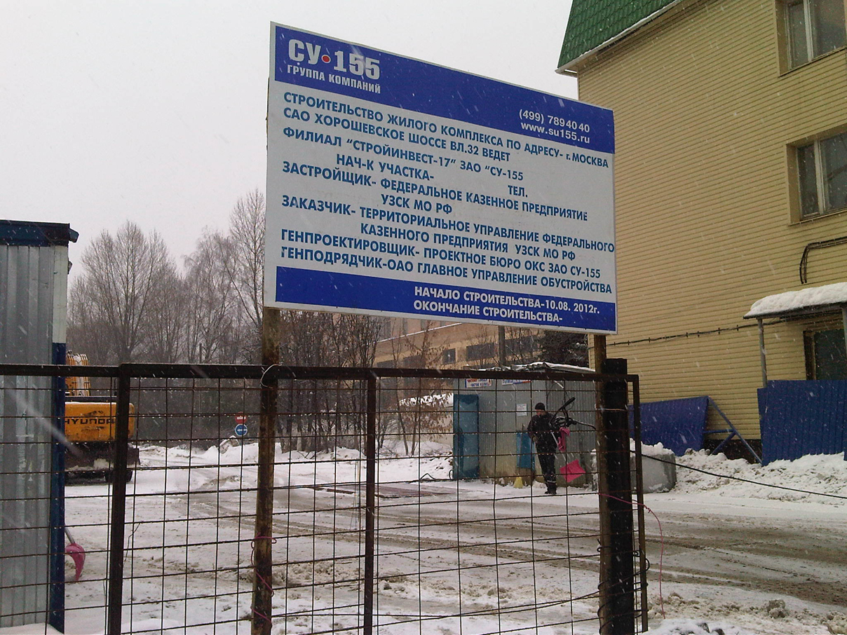 В этом районе Хорошевского шоссе много домов с номером 38: Прокуратура - Хорошевское шоссе д. 38 стр.1, суд - д. 38д, издательство Красная звезда - д. 38, издательство Красный воин д. 38а (видимо бывшая когда-то единой военная территория с формальным обозначением дом 38). Перед началом строительства на воротах ведущих на стройку (между прокуратурой, ОВД по Хорошевскому району и Полины Осипенко д. 10) и на воротах на другую стройку (между издательством Красная звезда, Пансионом воспитаниц МО РФ и автобазой МО РФ) висело объявление "Хорошевское шоссе владение 38. Строительство ведет СУ-155". Что будет - не указано, но территория освободилась приличная (после вывода в последнии 2 года нескольких частей). Год назад часть этой территории и прилегающие к ней общежития 27 НИИ МО РФ отошли к Пансиону воспитаниц МО РФ