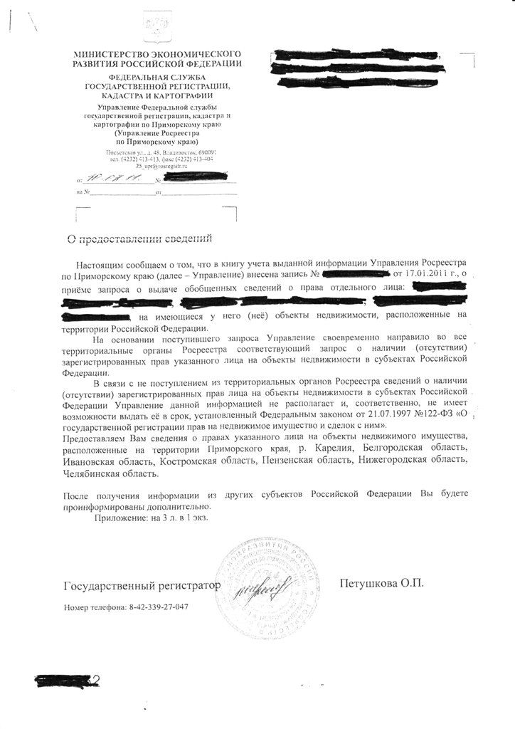 Справку по РФ обещал выложить я. Просто во первых по неясным причинам я не могу авторизоваться на форуме, вот только подключив к сети другой комп, я вошёл. Во-вторых я в тот вечех поехал отксерить справку и письмо, а жена этого субъекта категорически воспротивилась, дали только посмотреть. Письмо это из минэкономразвития, адресовано ей и тов. Колодяжному, реководителю росреестра по краснодарскому краю. Справка дана в виде "по Анапе записей нет" и далее перечислены ВСЕ регионы и напротив каждого-сведений нет. Это справка по всей РФ, так я понимаю?