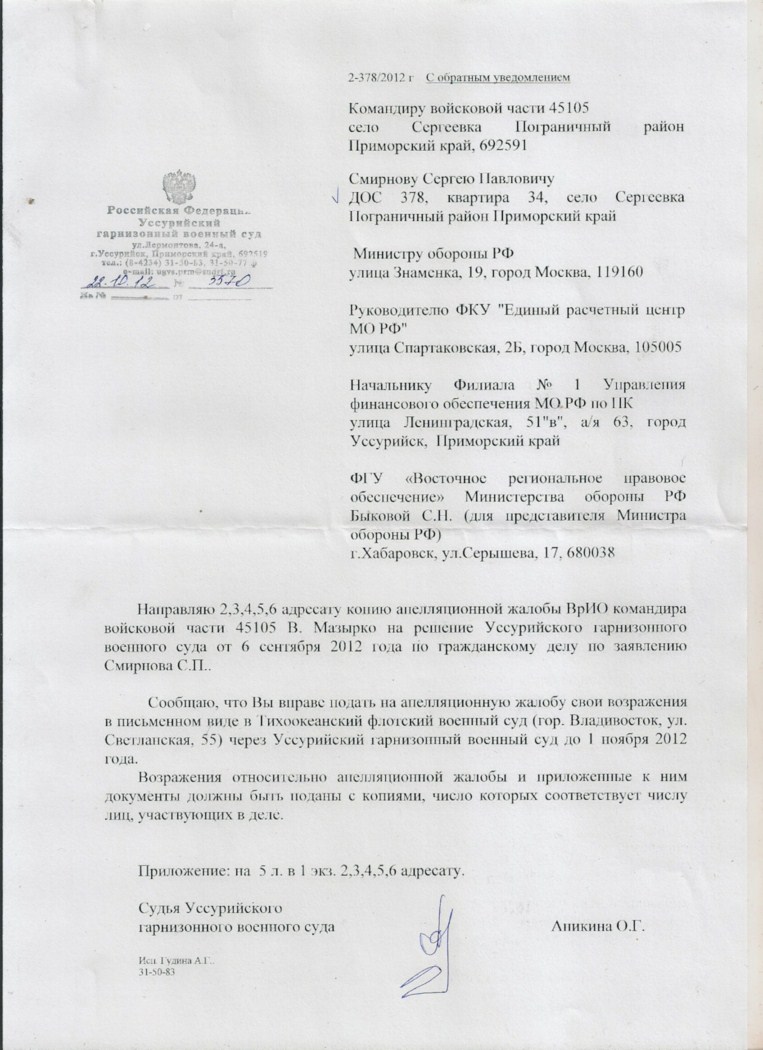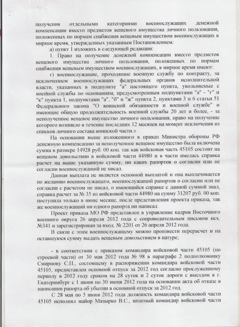 Предвидя это, я неоднократно рапортом обращалась к командованию части и вышестоящему командованию (копии зарегистрированных рапортов, а также описи ценных писем, которые отправляла, имеются). так же о по вещевому имуществу был мной рапорт (копия которого с резолюцией есть у меня). Вещевик отвечал, что будет приказ, только тогда сделает расчет, выдаст все справки о положенном мне имуществе и имеющимся на складе, для замены.