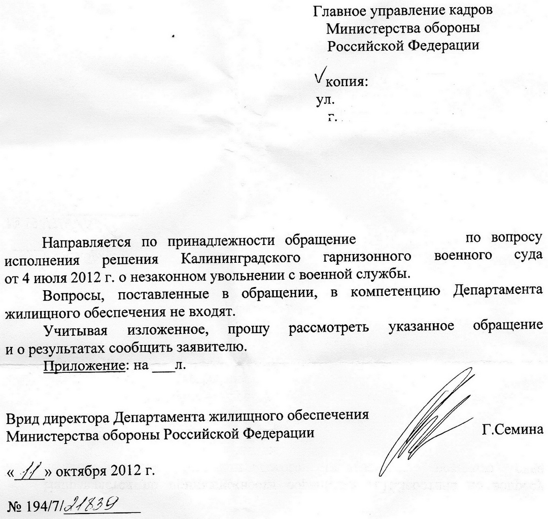 Обратился в адрес Министра обороны РФ с заявлением об исполнении решения суда, связанного с отменной приказа МО РФ в связи с необеспечением положенными видами довольствия. Вот какой "шедевр" получил: