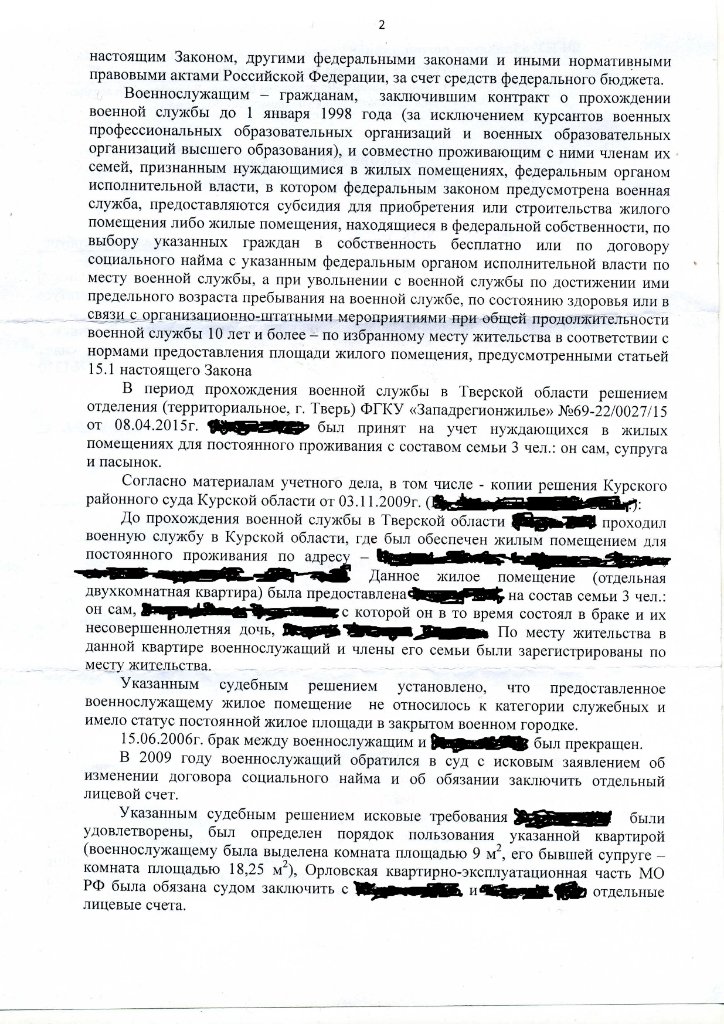 Заявитель был обеспечен по месту военной службы в поселке Сиверский-2 Ленинградской области трехкомнатной квартирой в доме N 58 по установленным нормам на всех членов семьи. После развода с женой, раздела жилой площади и сдачи в ноябре 2002 г. принадлежащей ему части в размере 12,4 квадратных метров муниципальному органу - муниципальному унитарному предприятию жилищно-коммунального хозяйства Сиверского теплоэнергетического комплекса Г. обратился в жилищную комиссию воинской части с просьбой о признании его нуждающимся в получении жилья в том же населенном пункте, что и было сделано жилищной комиссией воинской части в январе 2003 г.