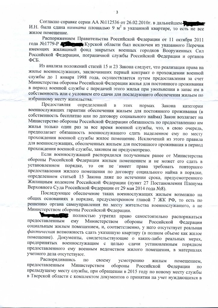 Вместе с тем согласно п. 5 ст. 15 ФЗ "О статусе военнослужащих" в случае освобождения жилых помещений, занимаемых военнослужащими и совместно проживающими с ними членами их семей, за исключением жилых помещений, находящихся в их собственности, указанные помещения предоставляются другим военнослужащим и членам их семей. Аналогичные положения закреплены в п. п. 32 и 33 Инструкции о порядке обеспечения жилыми помещениями в Вооруженных Силах РФ.
