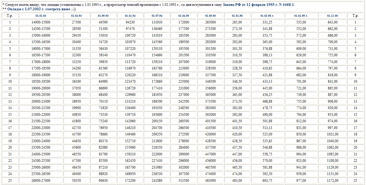Всем праздничного Доброго дня. Мы с товарищем занялись "раскопками" возникшего вопроса: В расчётной книжке при увольнении расписан должностной оклад= 301,5руб., 4 тарифный разряд. Однако в Нэте нашли сведения, что по состоянию на декабрь 1998г. размер этого должностного оклада соответствовал 5 тарифному разряду.В облвоенкомате ему твердят одно - для руководства нам необходимо всего лишь запись в расчётной книжке.Тарифный разряд присваивается должности согласно приказу МО РФ.