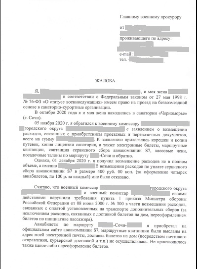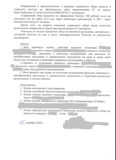 #1677Военкомат не оплатил сервисный сбор авиакомпании S7 за приобретение билетов в санаторий.
