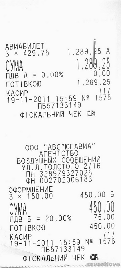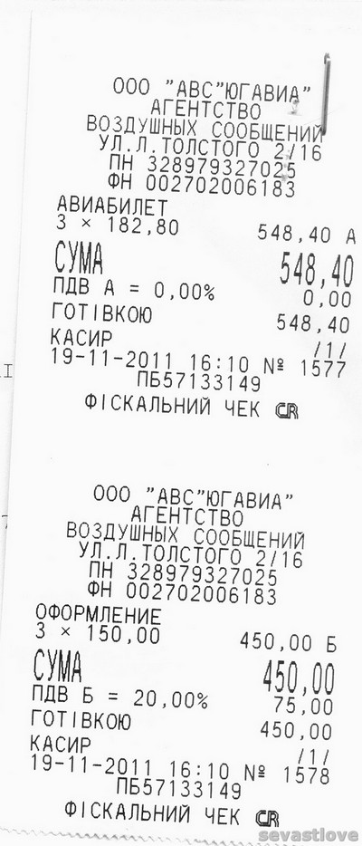 В декабре 2011 г. моя семья возвращалась из отпуска за 2011 г. В городе-герое Севастополе в агентстве Югавиа по ВПД были приобретены авиабилеты Симферополь - Москва- Архангельск. Было при этом затрачено сбор за авиабилеты ~1800 грн. и 150 грн. за каждый билет (на троих в 900 грн. обошлось). Оператором Югавиа были выданы только чеки кассового аппарата и эл.билеты. Так вот местное УФО оплатило только сбор за авиабилеты (эта цена в эл.билете проходила в рублях), а на чеки кассового аппарата никак не отреагировали!